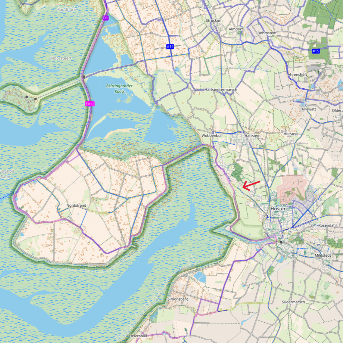 • Ihre Fahrräder können Sie direkt in der Wohnung oder in dem abschließbaren und videoüberwachten Gartenhaus abstellen. Direkt vor unserem Haus beginnen 6 Radwanderwege von leicht bis schwer, rund um die wunderschöne Husumer Bucht, in Nordfriesland oder hinauf nach Dänemark oder bis Hamburg. Eine direkte Übersicht der Wanderwege samt Markierung unseres Friesenhofes finden Sie im folgenden von ©Openstreetmap