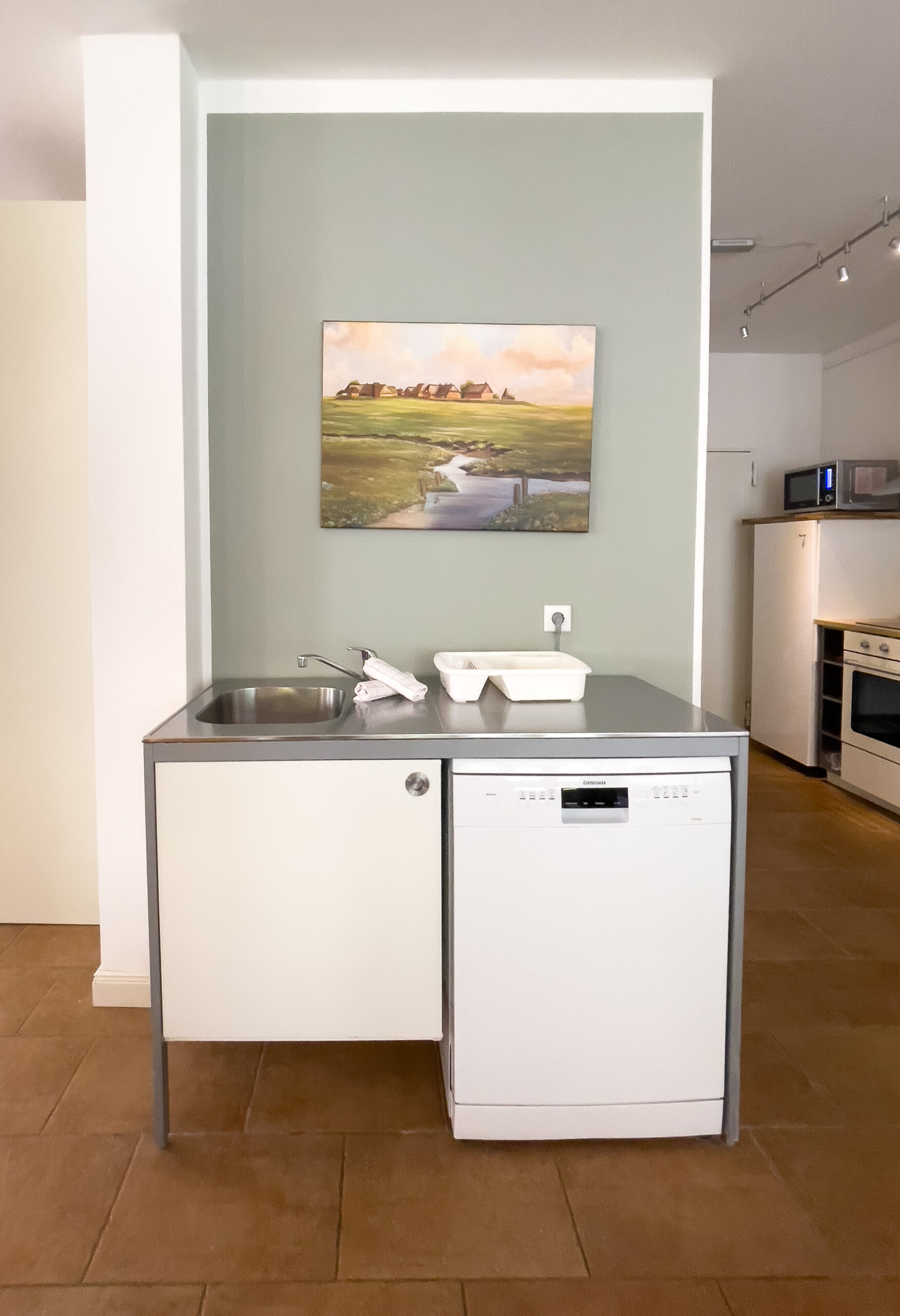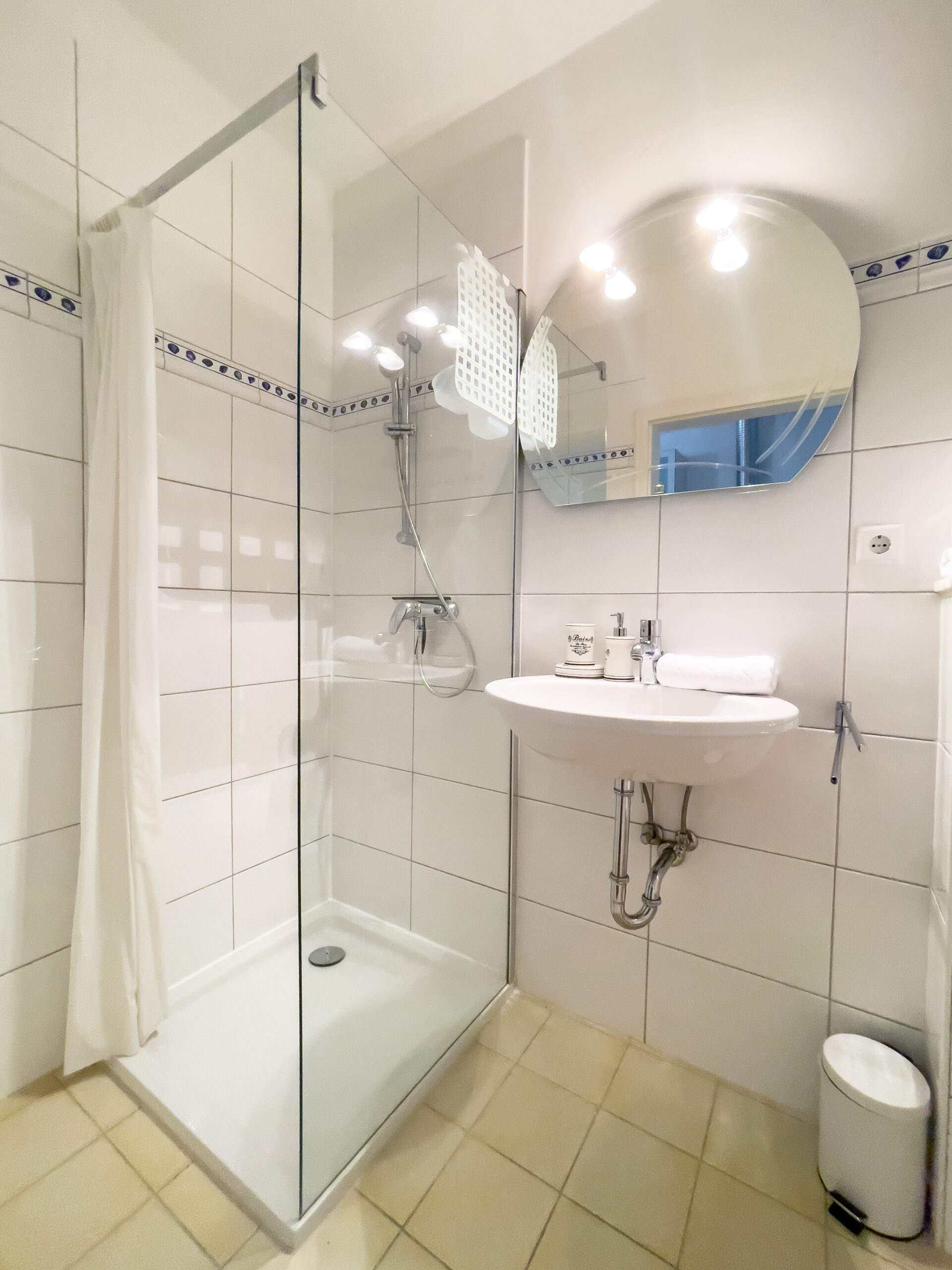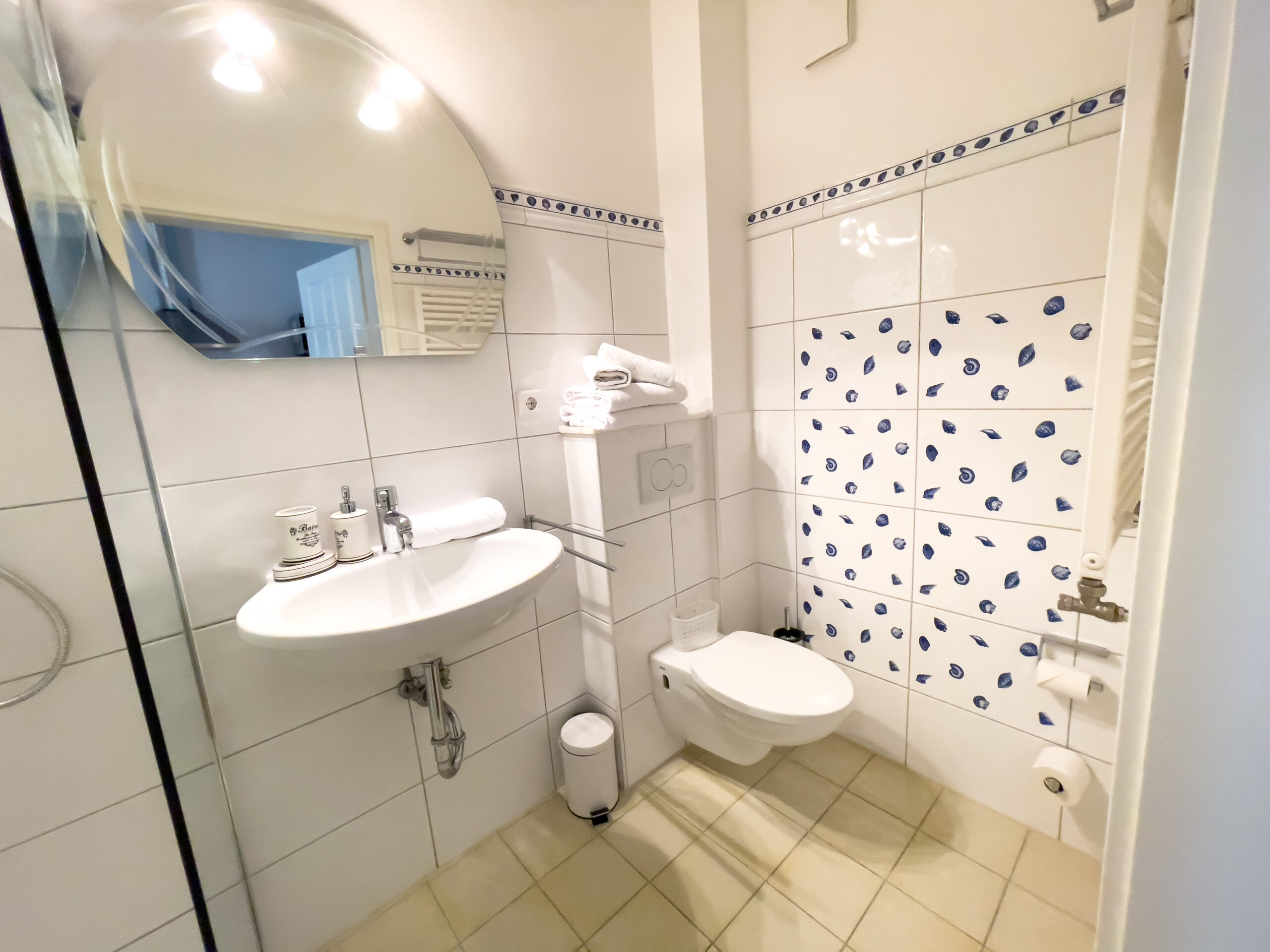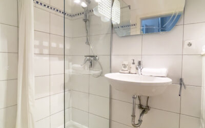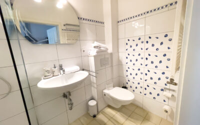 Das Badezimmer ist mit einer ebenerdigen Dusche ausgestattet und klein, aber fein.